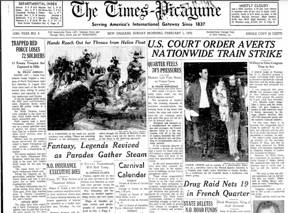 The first show was a triple bill with The Flock (a Midwest band somewhat like Blood, Sweat & Tears), Fleetwood Mac (w/Danny Kirwan and Jeremy Spencer), and Grateful Dead. It was on this night, following the show, that police were waiting at the Dead’s hotel in the French Quarter, warrants in hand (though they’d already searched the rooms), ready to arrest 19, members of the band and crew in a drug bust. The Times-Picayune reported the story the next morning, “Drug Raid Nets 19 in French Quarter,” noting that among those arrested included “The King of Acid,” Augustus Owsley “Bear” Stanley III. The band and then-manager Lenny Hart swore it was a set-up, like a bowling pin. Fleetwood Mac and the Dead would play a “Bread For The Dead” benefit the next night, with all proceeds going toward legal costs and setting up a fund for future events such as this. The Dead used their take to bail out the remainder of their crew and friends.