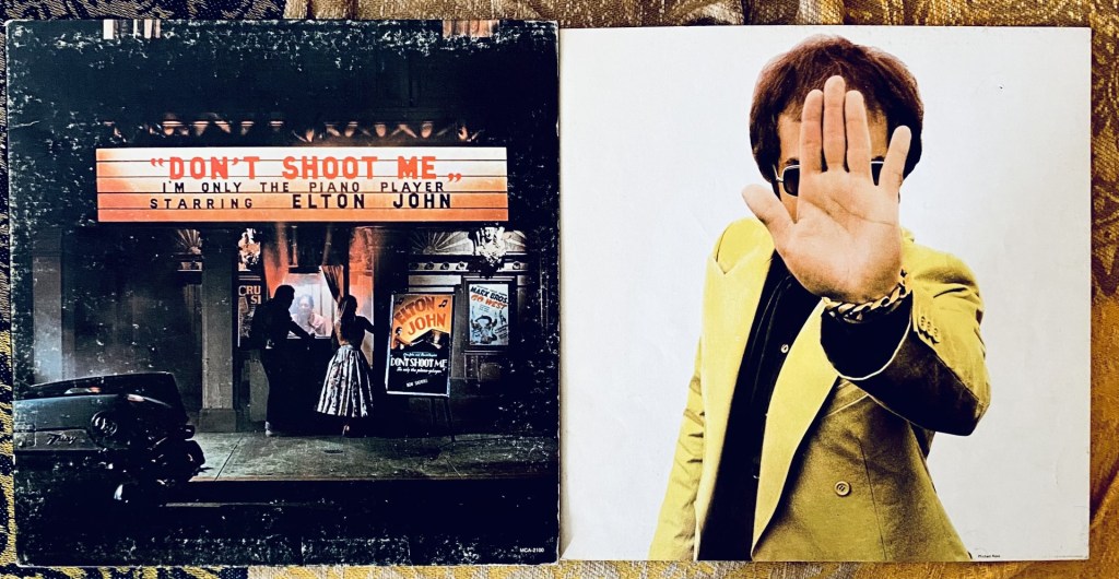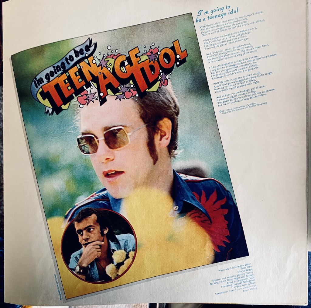 This would be the 2nd Elton John album I’d own, the first being the predecessor, Honky Chateau. Before Honky Chateau was Madman Across The Water. Some fans took these consecutive titles as commentary from a British artist on American politics, with the “Madman” referring to Nixon, and Honky Chateau being “White House.” Don’t Shoot Me… is one of only 3 of Elton’s albums to be recorded solely with his legendary band of Davey Johnstone, Nigel Olsson and Dee Murray, without percussionist Ray Cooper. The album includes a song about his friend Marc Bolan, “I’m Going to Be a Teenage Idol.” From the booklet:
