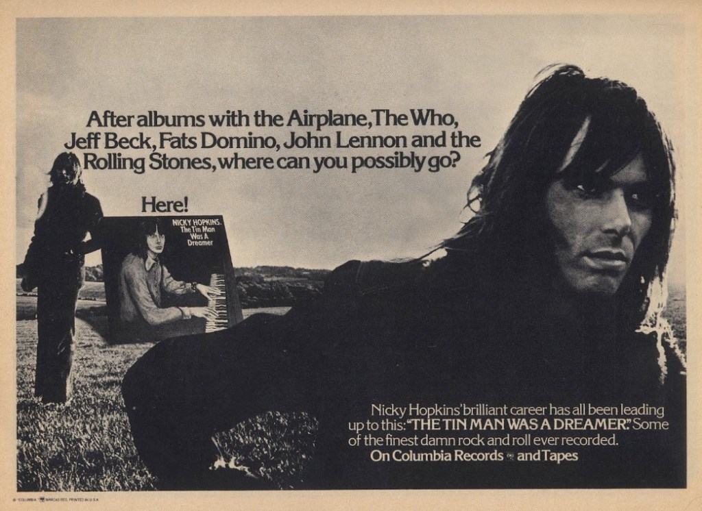 Hopkins had a lifelong struggle with Crohn’s Disease, operations for which lead to him being bedridden for nearly two years, during which time the All Star’s disbanded following Cyril Davies’ passing from leukemia. Due to Nicky’s ongoing health struggles, once he gained back his strength, he pursued the life of a session musician. Over the course of his career, he would play memorable piano parts for The Beatles, The Kinks, The Who, Jefferson Airplane (including the band’s appearance at Woodstock), Harry Nilsson, Graham Parker, New Riders of the Purple Sage, Joe Cocker, The Easybeats, Joe Walsh, Badfinger, and many, many others. He would play sessions for John, Paul, George and Ringo individually.